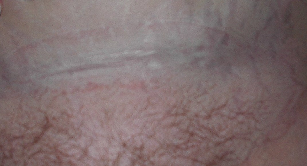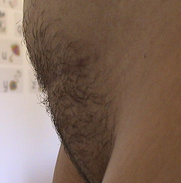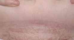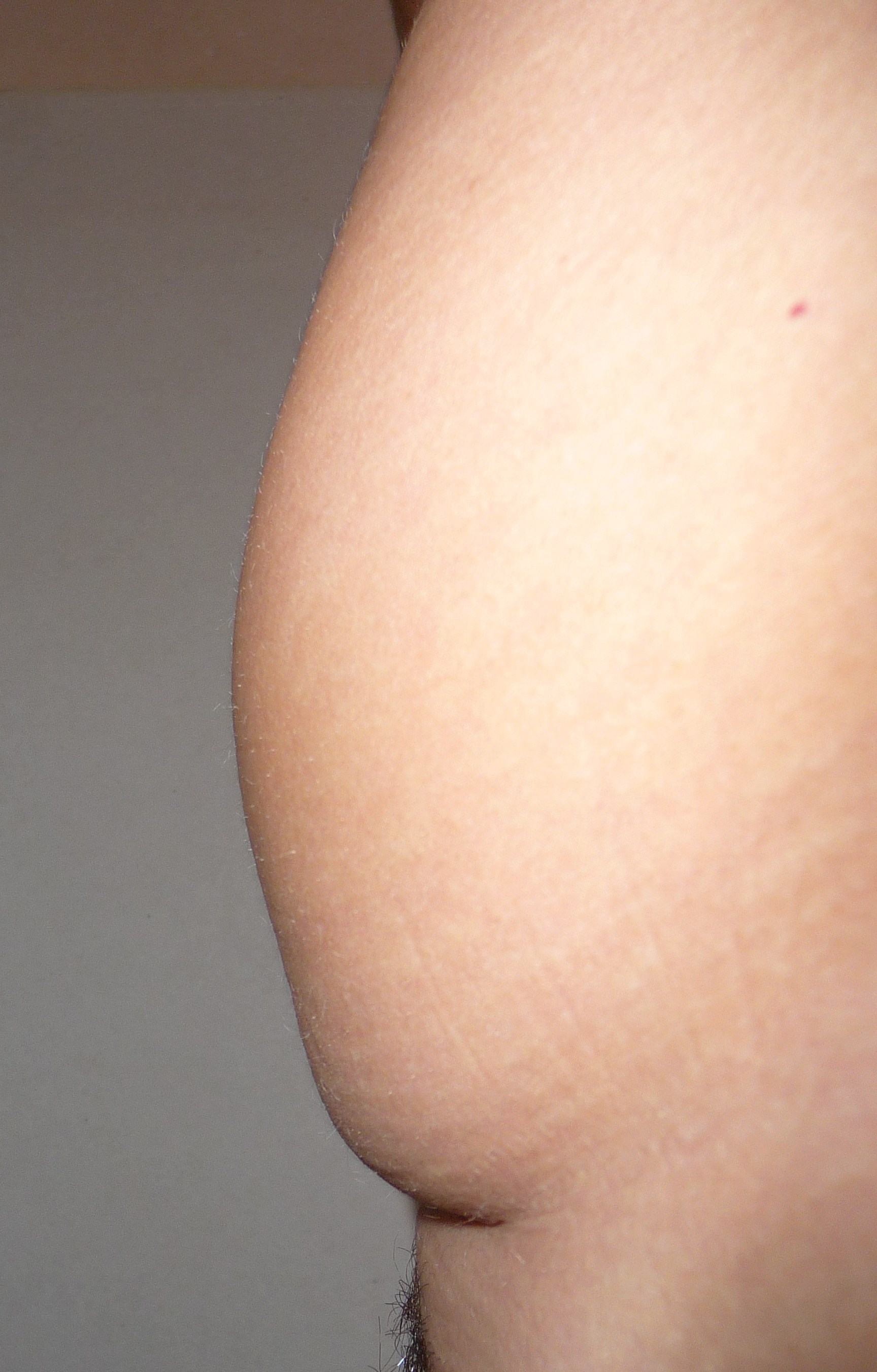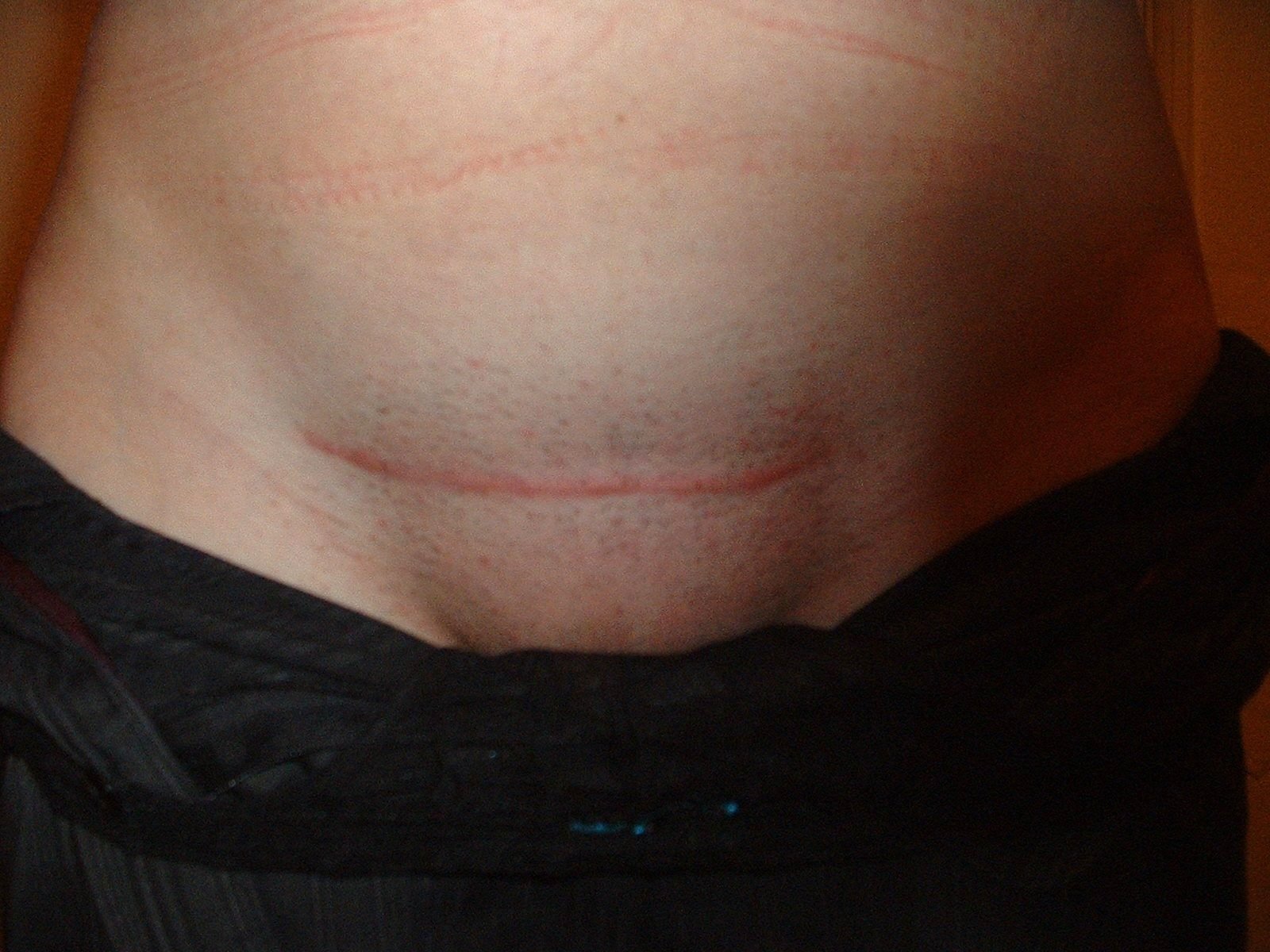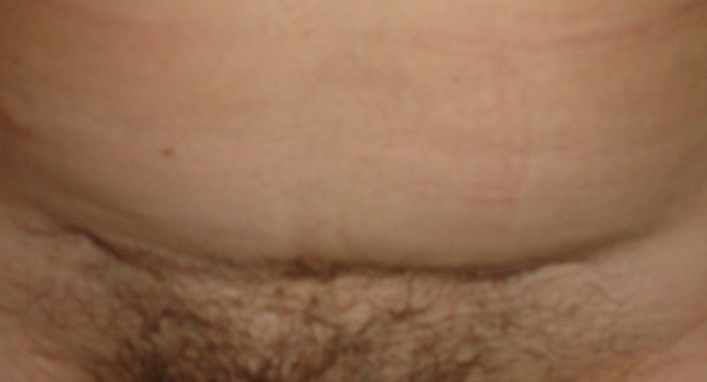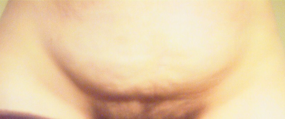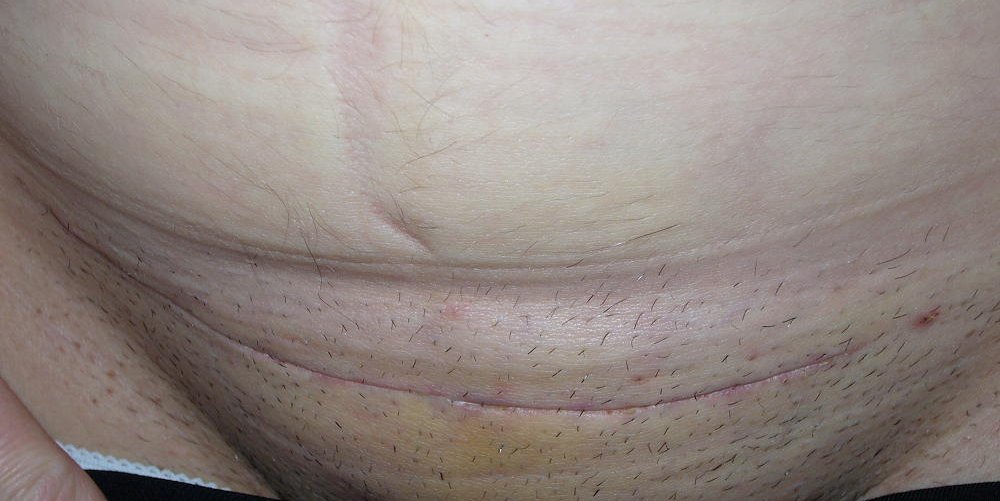 This was a first caesarean carried out in Cyprus. The first pair of picture shows the scar from the front with and without the overhang held up, and the second pair from the