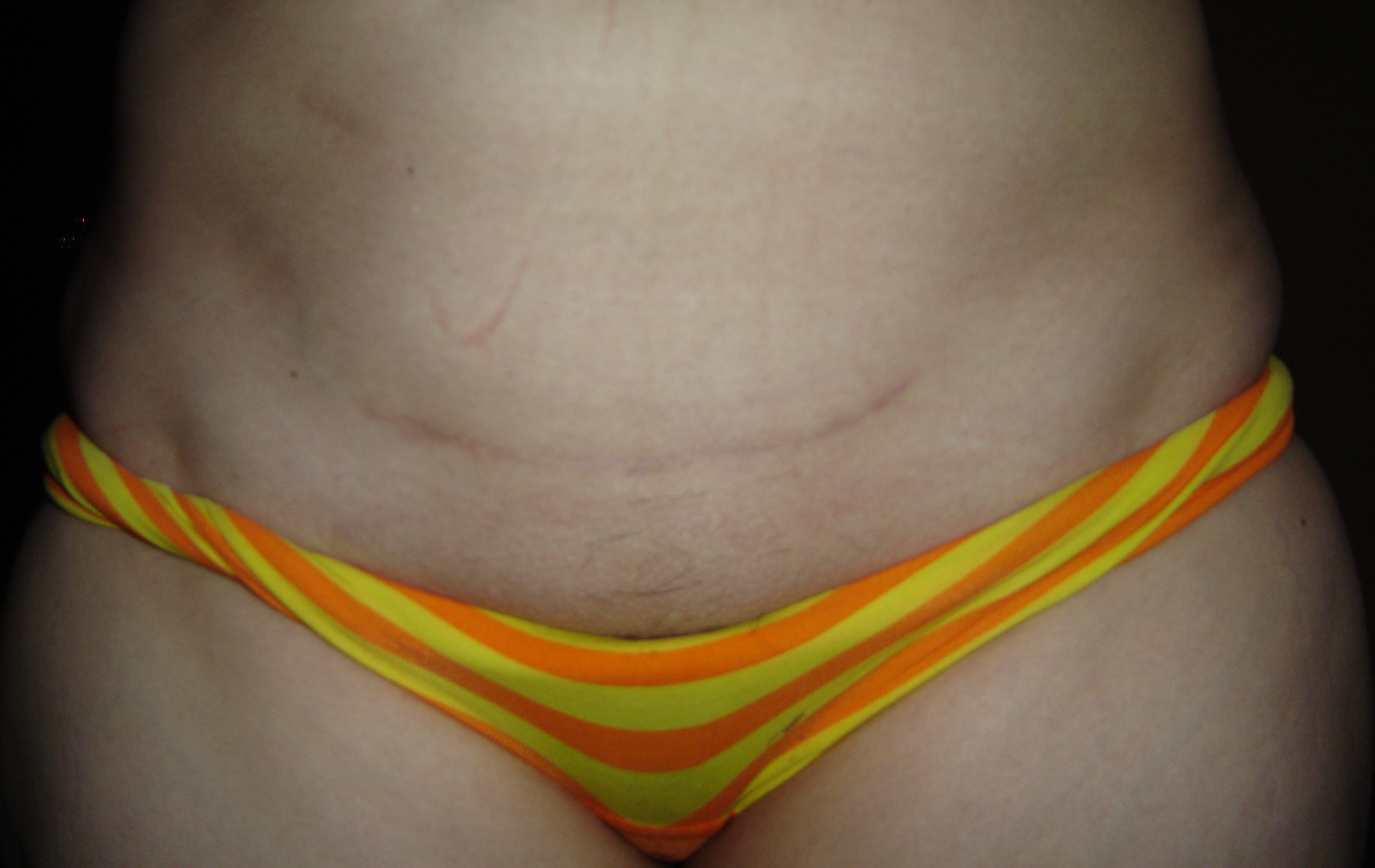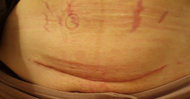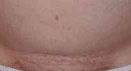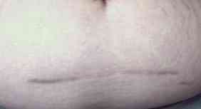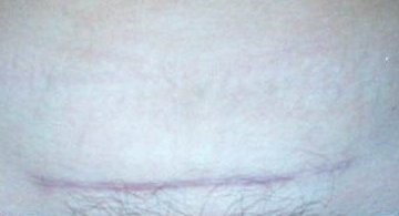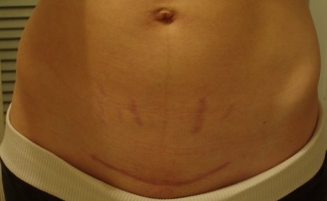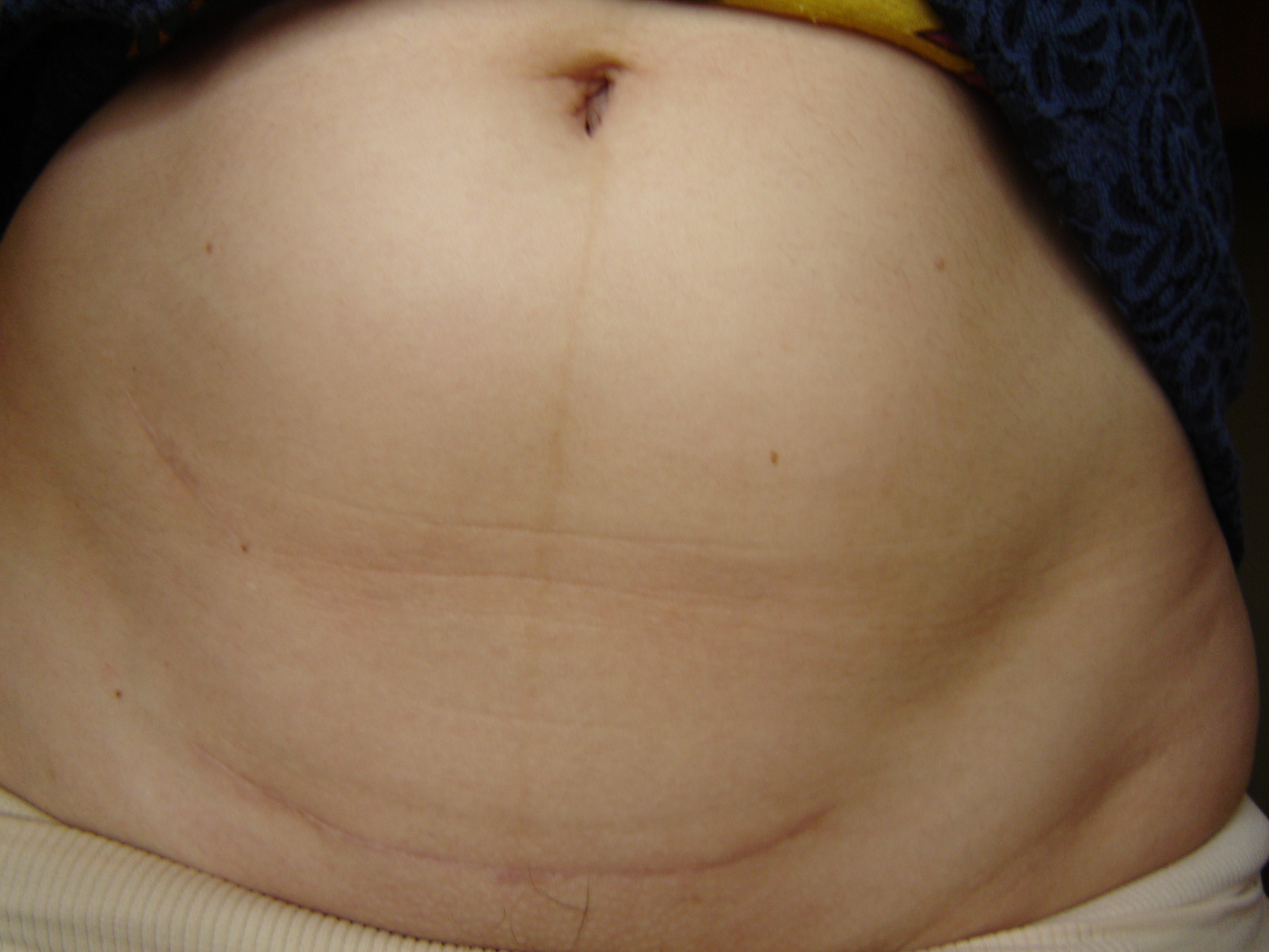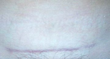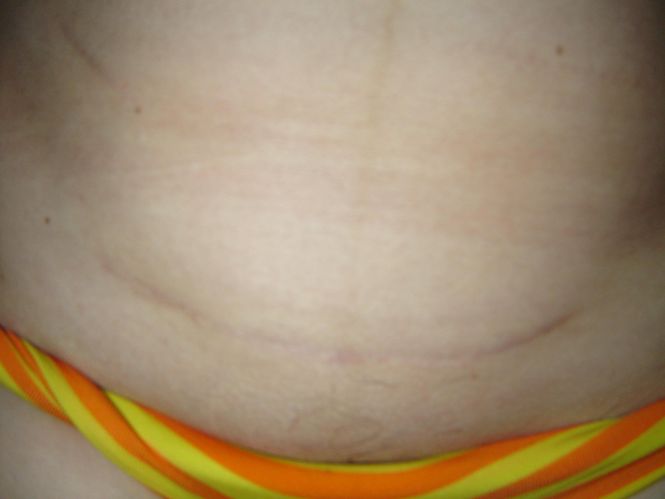 This was a third caesarean carried out in UK. The first picture the mother has held up the "ceasarean overhang", the scar is indented as the