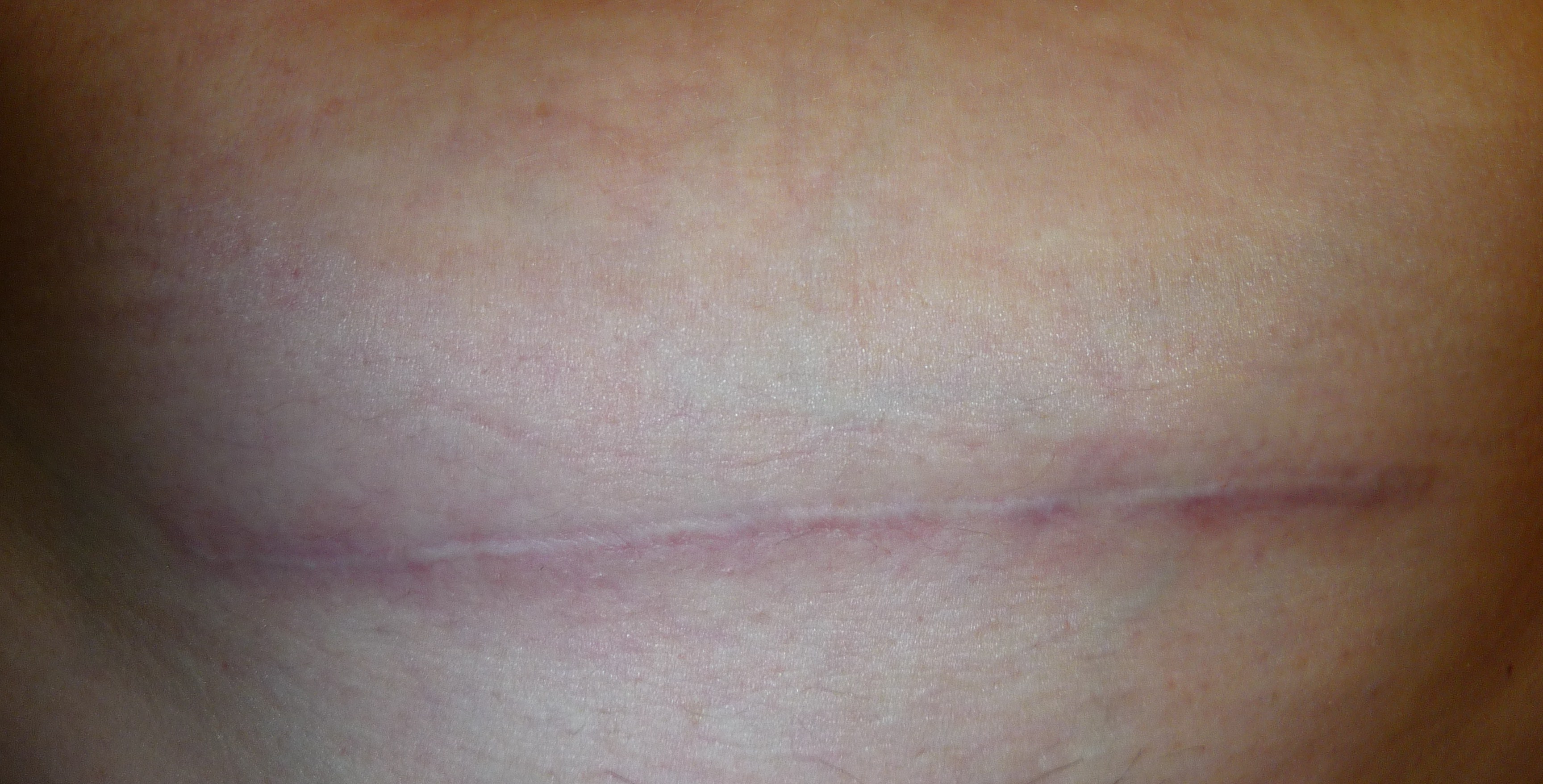 This was a first caesarean carried out in UK. The scar took about 18 months to lose its red /pink colour